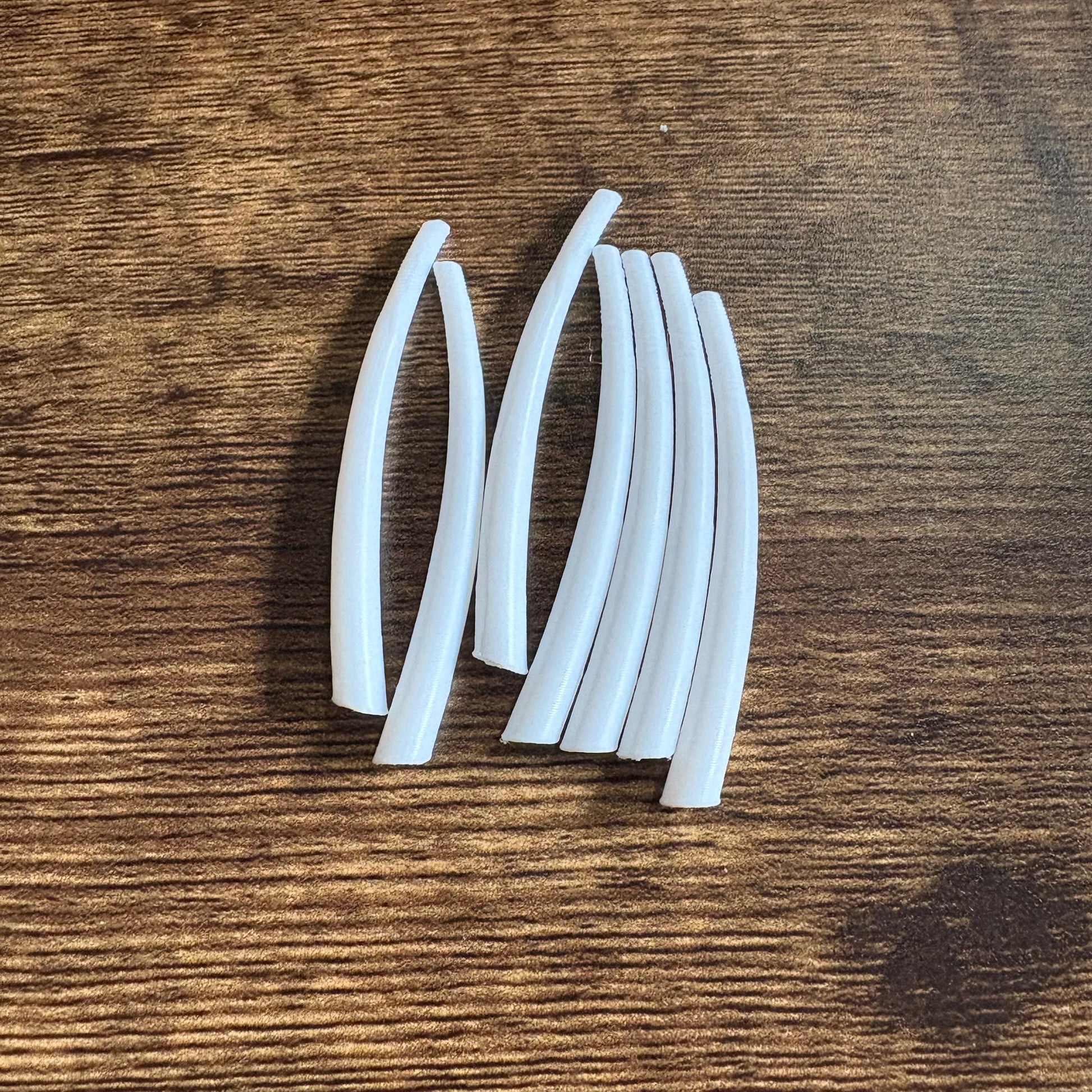These are inspired by dentalium but are designed and printed by me. They are made out of PLA, a bio plastic that can biodegrade. Can be used for pieces where using true dentalium isn’t possible, affordable, or sustainable. Plus it means you can make vegan pieces.